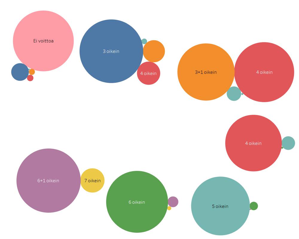 Tein aiemmin hieman kökön, mutta toivottavasti havainnoillistavan graafin lottovoittojen todennäköisyyksistä aina poistaen seuraavaan ryhmään, edellisen ryhmän todennäköisimmän tuloksen. Eli "Ei voittoa poistettiin" jolloin "3 oikein", oli seuraavaksi todennäköisin jne. 7 oikein, oli työn ja tuskan takana saada edes esiin. Minkä takia lottoamme, kun tiedämme todennäköisyyksien olevan niin heikot? Onko kummassakaan (kuolema tai lotto esimerkissä) voitettavaa jos keskitymme toisiin ääripäihin.